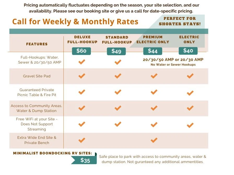 • Refunds without 30 days notice will not be given due to the discomforts of nature, government shutdowns, water/ power outages, your RV breaking down, health issues; or essentially anything out of our control.